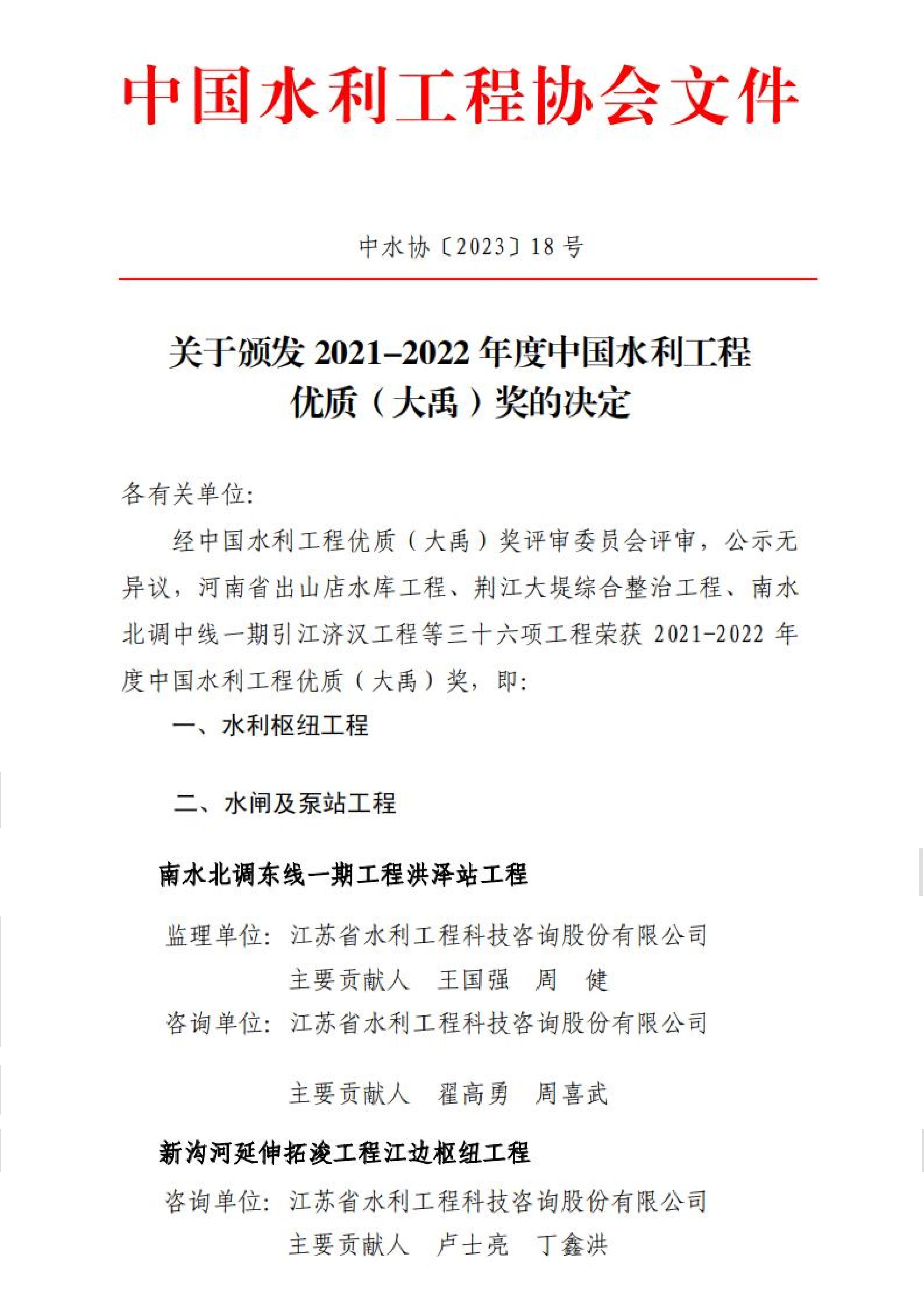 近日,根據(jù)中國水利工程協(xié)會(huì)發(fā)布的《關(guān)于頒發(fā)2021-2022年度中國水利工程優(yōu)質(zhì)(大禹)獎(jiǎng)的決定》(中水協(xié)〔2023〕18號(hào)),由我公司監(jiān)理、咨詢的南水北調(diào)東線一期工程洪澤站工程,咨詢的新溝河延伸拓浚工程江邊樞紐工程榮獲中國水利工程優(yōu)質(zhì)(大禹)獎(jiǎng)稱號(hào)。