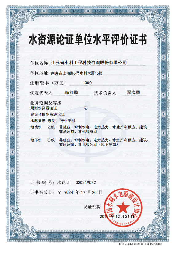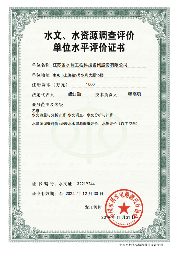 經(jīng)中國(guó)水利水電勘測(cè)設(shè)計(jì)協(xié)會(huì)核準(zhǔn),我公司取得水資源論證單位水平評(píng)價(jià)乙級(jí)證書,證書編號(hào)為水論證320219072,水文、水資源調(diào)查評(píng)價(jià)單位水平評(píng)價(jià)乙級(jí)證書,證書編號(hào)為水文證32219244。