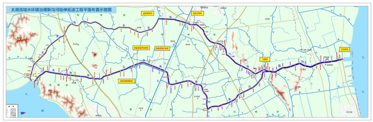 新溝河延伸拓浚工程(以下簡稱“新溝河工程”)位于常州、無錫兩市境內(nèi),沿線經(jīng)過無錫市濱湖區(qū)、惠山區(qū)和江陰市,常州市天寧區(qū)、新北區(qū)、武進(jìn)區(qū)。工程主要建設(shè)內(nèi)容由河道延伸拓浚工程、堤防工程、護(hù)坡護(hù)岸工程、閘站樞紐工程、跨河橋梁工程、口門控制工程和水系調(diào)整工程等組成。其中河道延伸拓浚工程97.47km,新建和加固堤防111.84km,修建堤頂瀝青防汛道路83.35km,上堤道路3.15km,護(hù)坡護(hù)岸工程79.17km;修建閘站等樞紐建筑物8座,跨河橋梁105座,口門控制28處(其中封堵6處);水系調(diào)整工程河道疏浚59.14km,護(hù)坡、護(hù)岸6.81km,建設(shè)排澇、灌溉閘站25座,橋梁2座,排水管道500m。批復(fù)總投資56.4659億元。