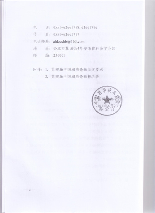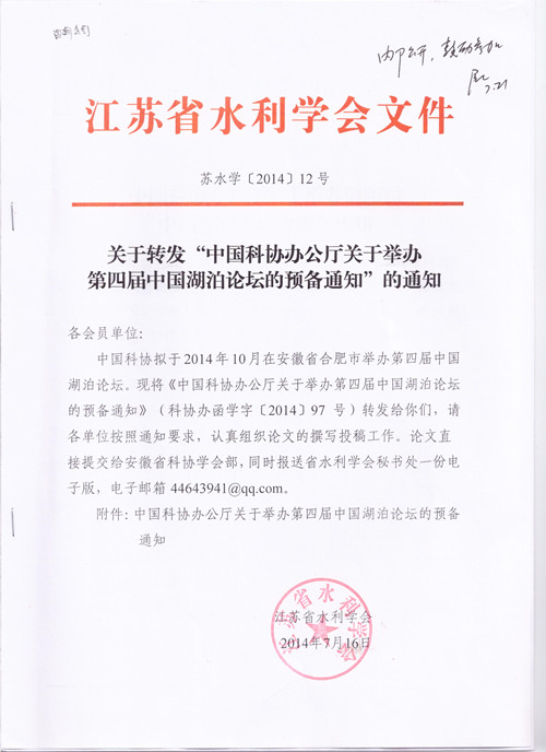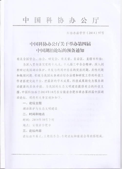 中國科協(xié)辦公廳關(guān)于舉辦第四屆中國湖泊論壇的預(yù)備通知