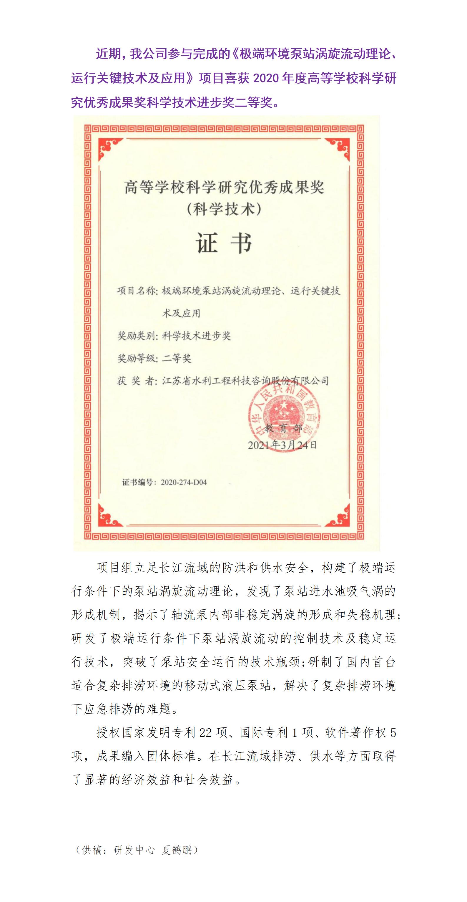 公司喜獲2020年度高等學(xué)?茖W(xué)研究優(yōu)秀成果獎科學(xué)技術(shù)進(jìn)步獎二等獎